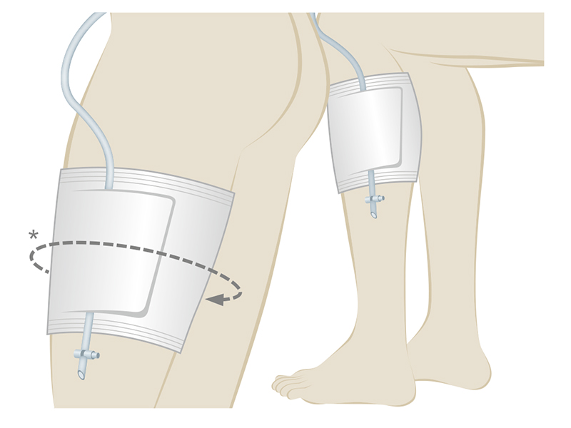 The UROMED leg bag holder permits the unremarkable wear of urine leg bags and offers a sufficient fixation by elastic, wide cuff.